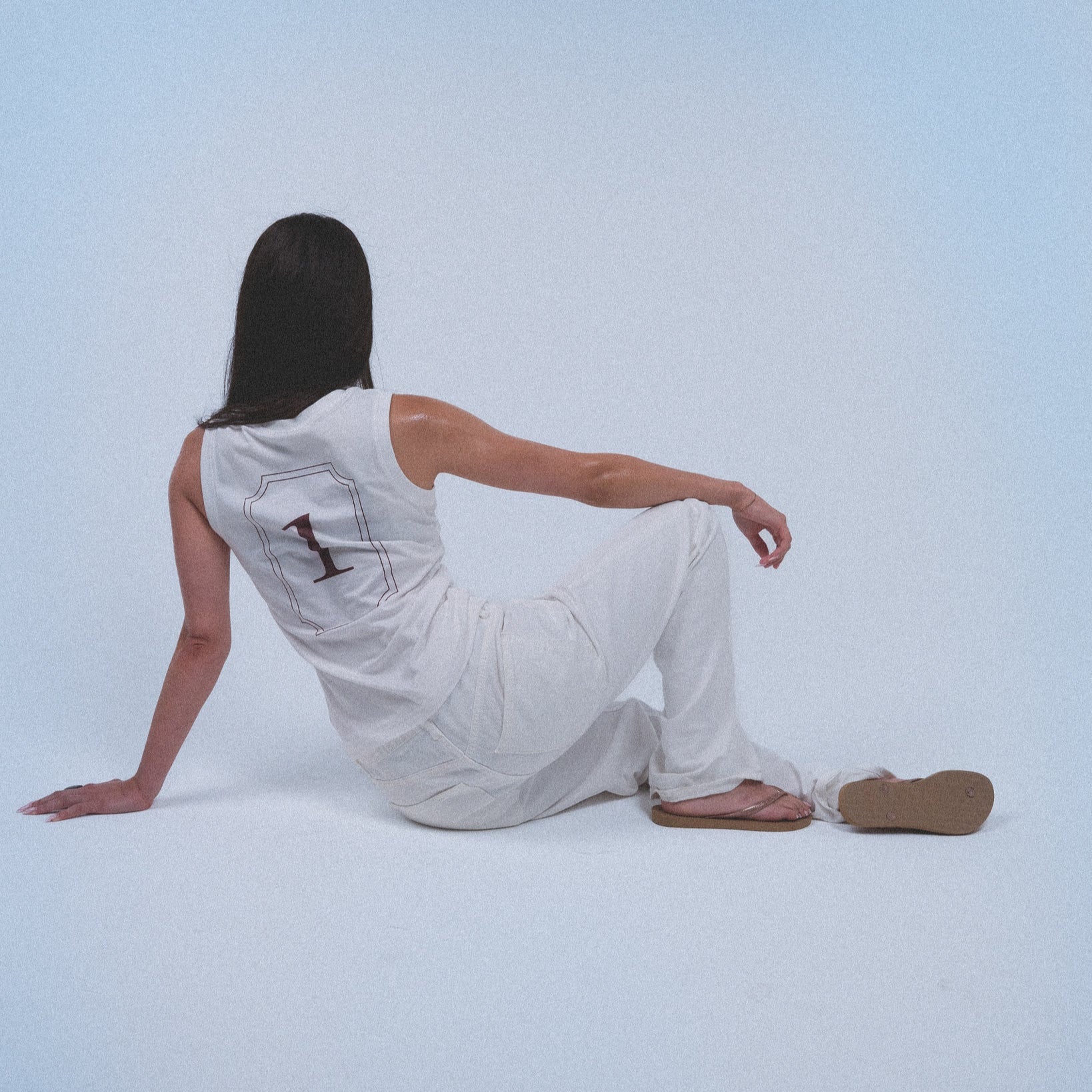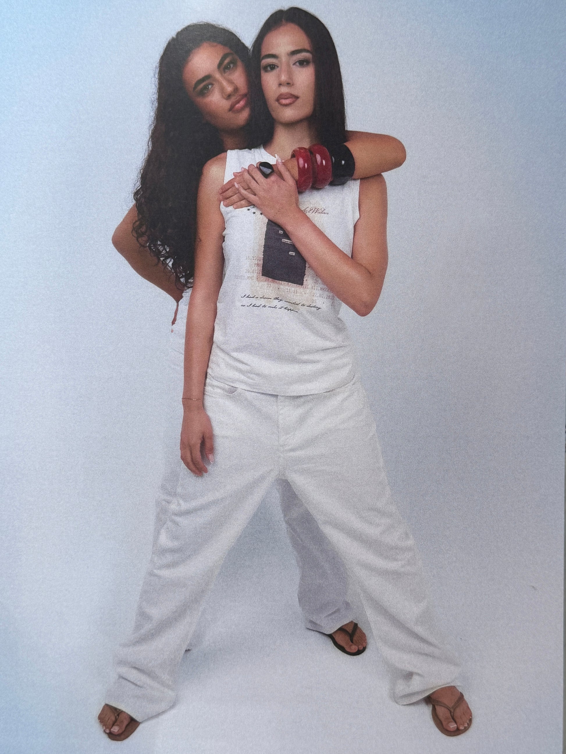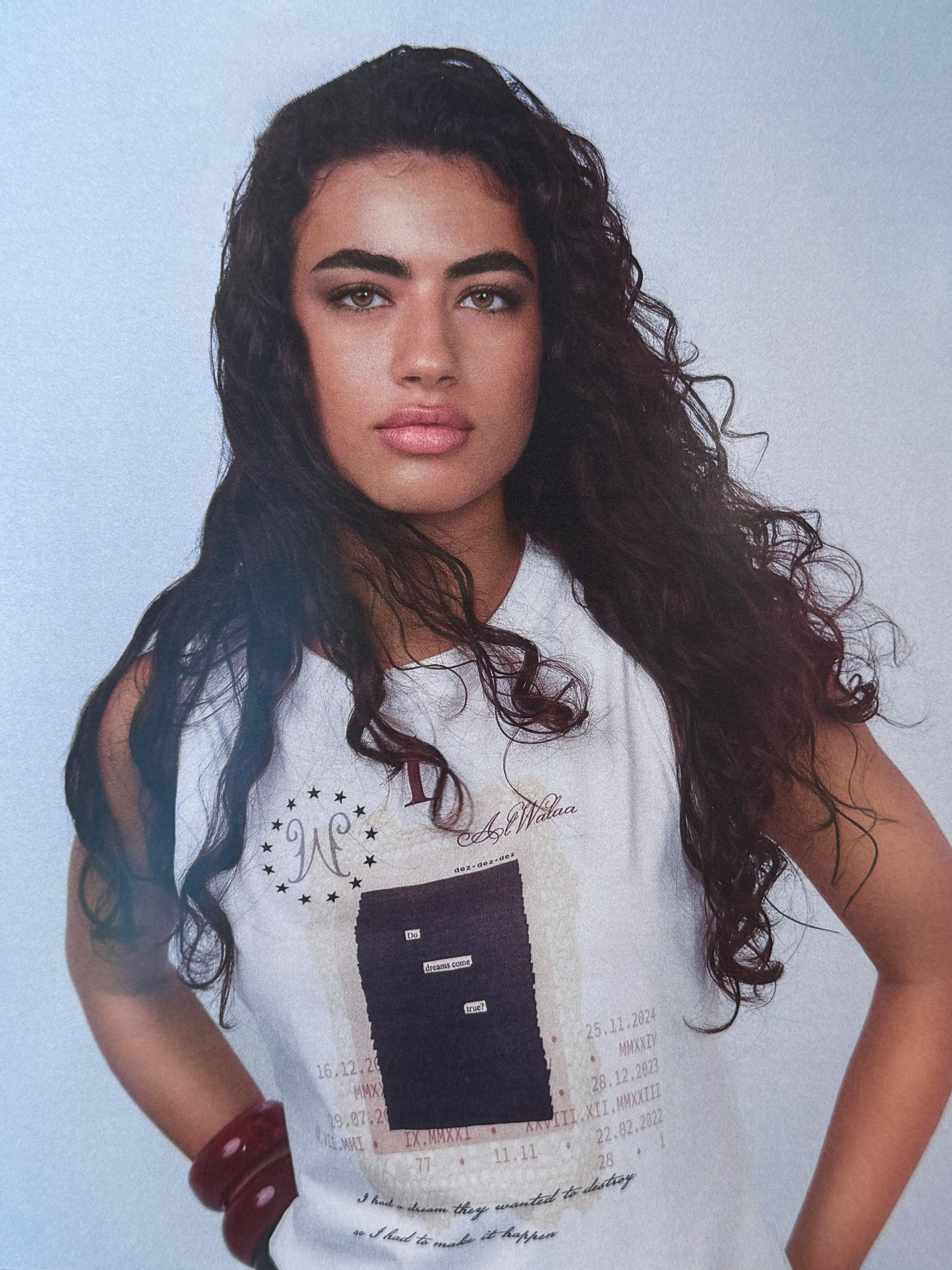 This tank top reflects AlWalaa’s vision of fabric as memory and print as archive — a piece that exists between fading and becoming. The graphic design captures fragments of time — dates, words, and symbols layered as an archive of memory.